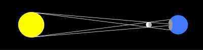 | Figure 2: The umbra and penumbra. The umbra is the darker inner shadow, the penumbra is the lighter outer shadow. The bottom picture shows the path of the light rays from the sun. |