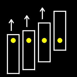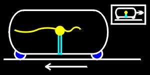 | Figure 4: The effect of a moving frame of reference on an object. To an observer outside of the box, the yellow ball looks as if it stays in the same place but the box moves. To an observer inside the box, the ball would look as it is falling, or being acted on by a gravitational field. |