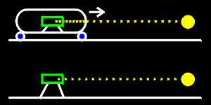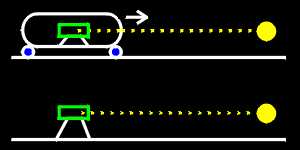 | Figure 2: The propogation of light if time is constant. The light from the light source moves away from the light source but is recieved by the train as faster than by the stationary detector. Note: The view of the inside of the train car is relative to the car. |