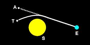 | Figure 5: The effect of the gravitational field of the sun on the apparent position of the stars. Because of the curvature of light around the sun (S), the star, as seen from earth (E) looks like it is at position A even though the star is really at position T. |