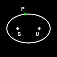 | Figure 1: An illustration of Kepler's first law. The planet (P) orbits the sun (S) in an elliptical orbit with one focus on the sun and the other focus on an unoccupied point in space (U). |