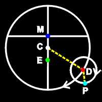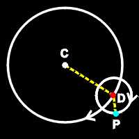 | Figure 2: The epicycle. The planet (P) revolves around the center of the epicycle (D) which in turn revolves around the center of the larger circle (C). |