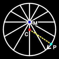 | Figure 3: The equant. The planet (P) revolves around the center of the circle (C) but moves uniformly around the center of motion (M). The planet goes through each section of the circle in an equal amount of time so it would speed up as it gets farther from M. |
