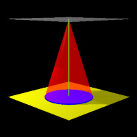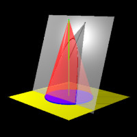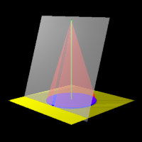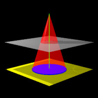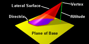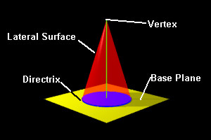 A cone is a solid 3D mathematical shape which lies on a plane and is bounded by a closed curve on the plane (usually a circle) called the directrix (the edge of the blue shape in the figures below). The lateral surface (side) of the cone consists of all of the line segments that intersect the directrix and a point not on the plane called the vertex. The altitude (height) of a cone is the line segment which is perpendicular to the plane of the base and intersects the vertex.