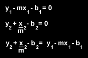 The equations of both lines are then combined using substitution after arranging each equation so that it equals 0. This will result in the coordinates of the point on line 1 that is closest to point 1 (the point at the intersection of the two lines).