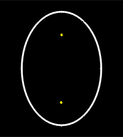 An ellipse, unlike a circle, has two focus points. For each point on the ellipse, the sum of the distance (D1) from the point to the first focus (F1) and the distance (D2) from the point to the second focus (F2) is always a constant.