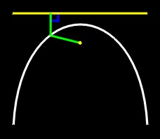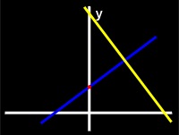 | Figure 11: The yellow line is the original line. The blue line is perpendicular to the yellow line and intersects the red point. The point at the intersection of the two lines is the closest point on the yellow line to the red point. |