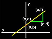 The constant m is usually a fraction. If you pick two points on the line (c,d) and (e,f), you can then draw two lines from those points to point (e,d) to make a right triangle. The height of that triangle (f - d) will be the numerator of m and the width of the triangle (e - c) will be the denominator of m. B will be the value of y when x = 0, it is usually found after m is found. This triangle is illustrated in the following figure.