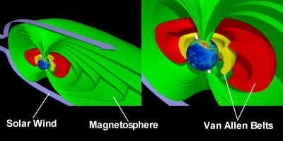 | Figure 2: The earth's magnetosphere, the solar wind, and the Van Allen belts. |