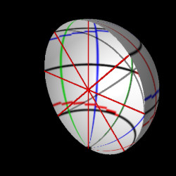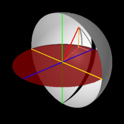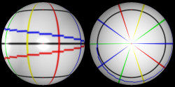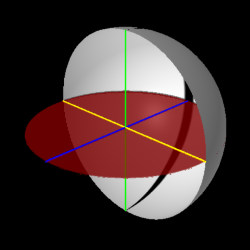 The sphere is centered at the origin and the xw, yw, and zw axes are defined in the image below where xw is blue, yw is yellow, and zw is green. The black line is the left and right edges of the image stretched around the sphere. The red disk is the plane made up of only the xw and yw axes, it also represents the "equator" of the sphere.