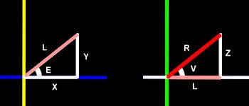 We can get the polar coordinates of any point in the 3D world (see figure 5) by first measuring the angle Eo the point's (xw,yw) coordinates make on the (xw,yw) plane (the red disk) and getting the distance of the line L (the pink line) it makes to the origin. We can then use the length of L to find the angle Vo between line L and line R, which is the line that goes directly to the point's (xw,yw,zw) coordinates. For instance we can take a point on the sphere which has the coordinates (x1w,y1w,z1w) and measure its polar coordinates on two planes. These lines are shown in the following figure. The red line (line R) goes directly to the point and has the length of the radius of the sphere, the pink line (line L) goes to the point's x1w,y1w coordinates only.