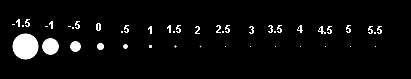 The radius of each star can be calculated with the following equations. S is a number used to smooth out the curve and make the radius of each magnitude closer to the last one. M0 is the radius of a star of magnitude 0. V is the visual magnitude of the star that you want the radius of. The second equation is there to emphasize that 2.5 is taken to the power of [(0 - V) * M]. The symbol ^ means "to the power of."