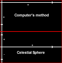 The computer references each pixel in an image by measuring from the top left of the image and going right and down. The coordinates for each pixel are always positive. Since we measure the position of stars on the celestial sphere from the equator up for positive values or down for negative values, the pixels in the image also must be measured from the middle and the polarity of the yi axis must be reversed so that positive values are measured going up, not down. The following image illustrates the two methods: